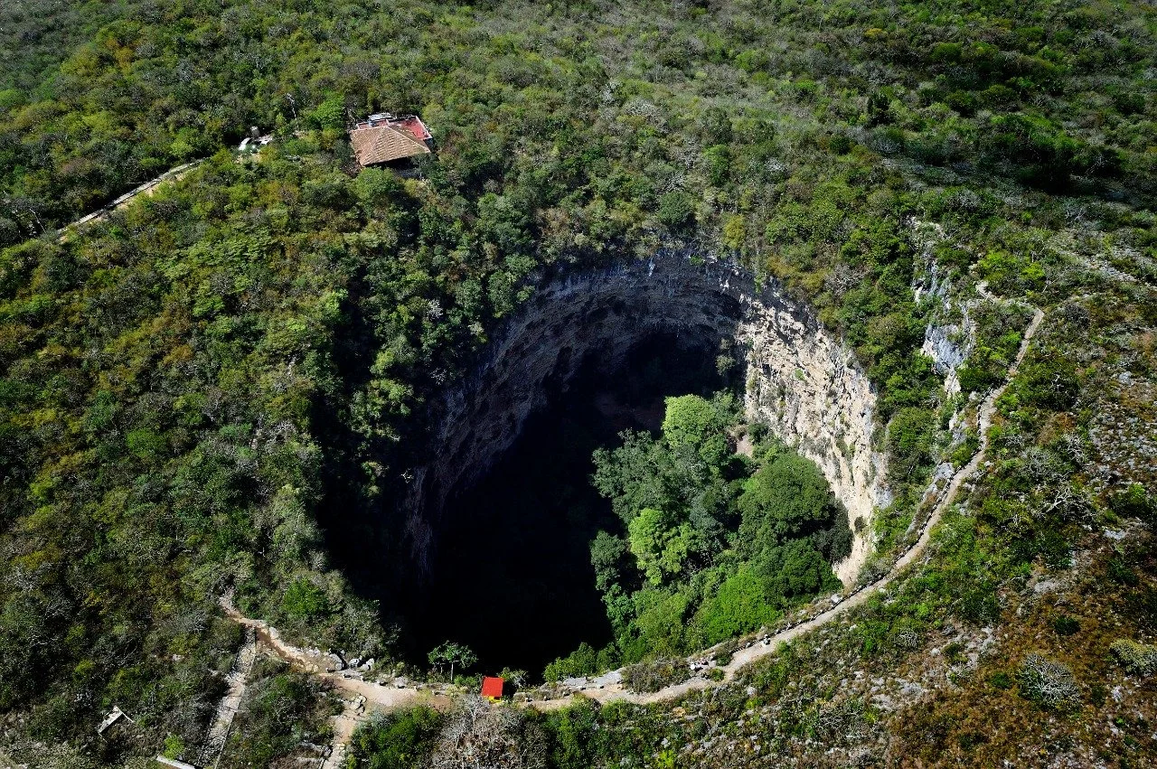 Imagen aérea de la Cima de las Cotorras en Chiapas rodeado de vegetación, con un camino que lo rodea y un pequeño edificio con techo rojo cerca del borde.